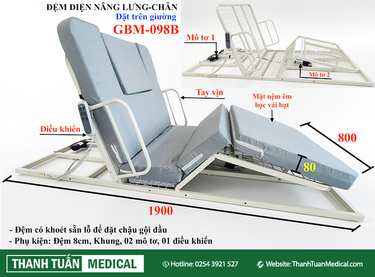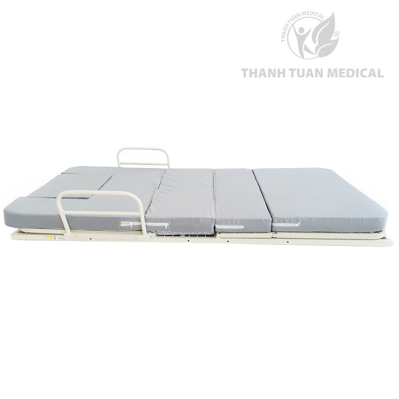 - Với thiết kế chống ngã và tay vịn mở rộng 50cm, hai bên gắn liền với khung đệm nâng, giúp người bệnh có thể tựa, vịn hoặc kéo khi cần ngồi dậy mà không cần người trợ giúp.