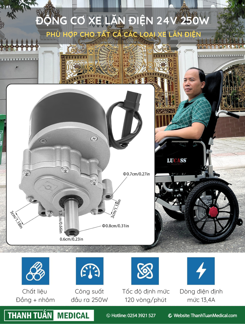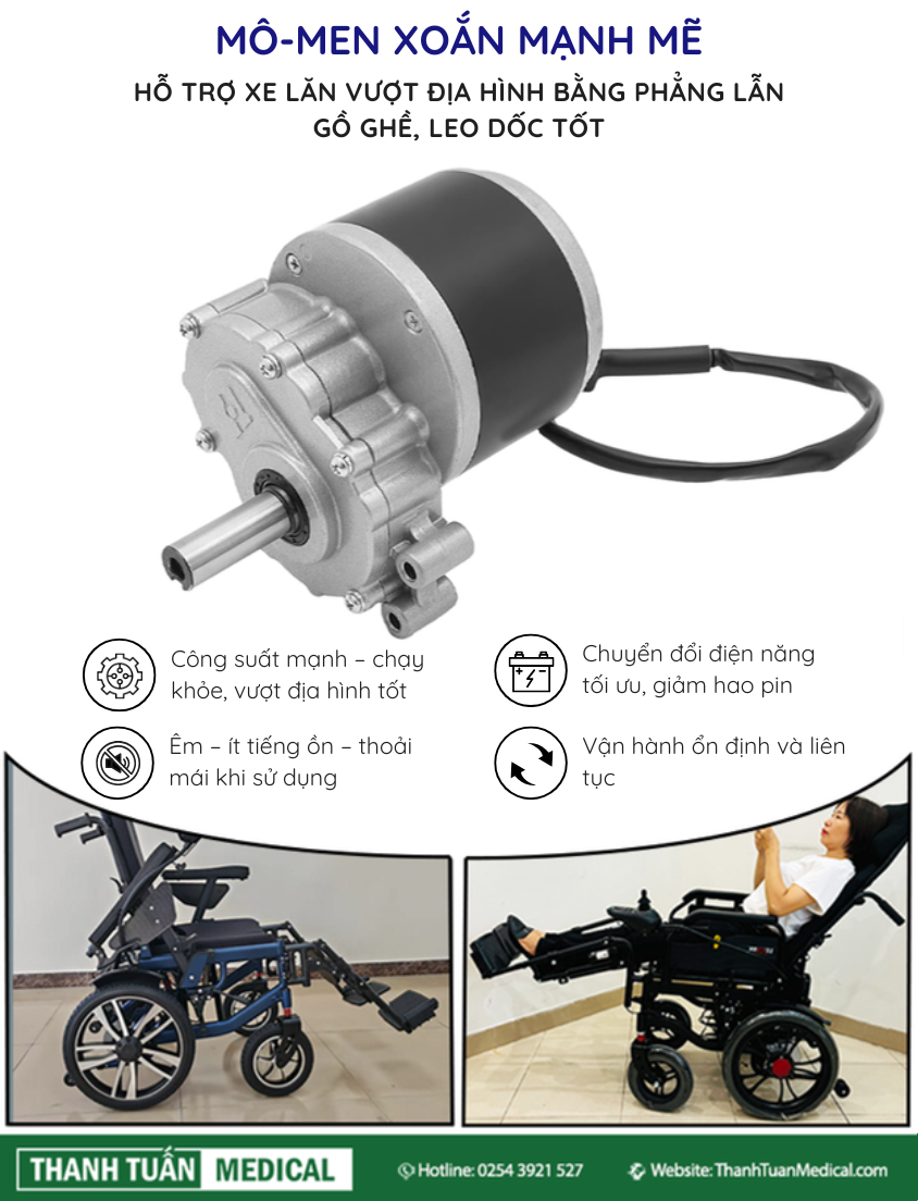 - Mô-men xoắn mạnh, hỗ trợ xe lăn vượt địa hình bằng phẳng lẫn gồ ghề, leo dốc tốt.