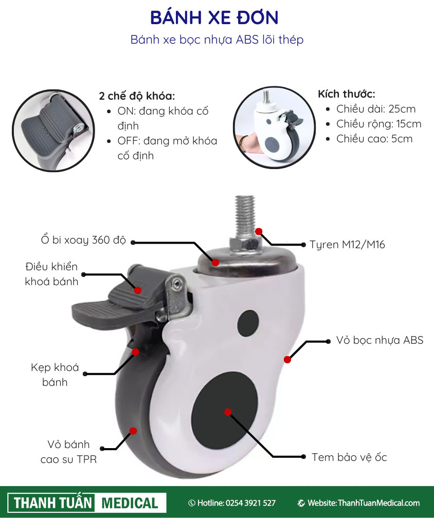 - Xoay 360 độ linh hoạt giúp di chuyển dễ dàng trong không gian chật hẹp, phù hợp cho môi trường bệnh viện, phòng khám.