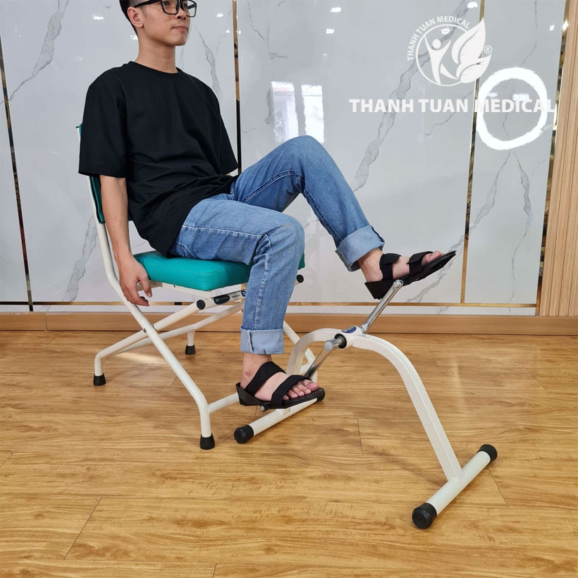 - Dùng ghế ngồi sử dụng tại nhà nhưng ghế phải bảo đảm chắc chắn, xe đạp để phía trước ghế, 2 chân người bệnh để trên 2 chiếc guốc, dán dây chặc vừa với bàn chân, đầu xe đạp để sát tường hoặc có vật cản để xe không bị dịch chuyển.