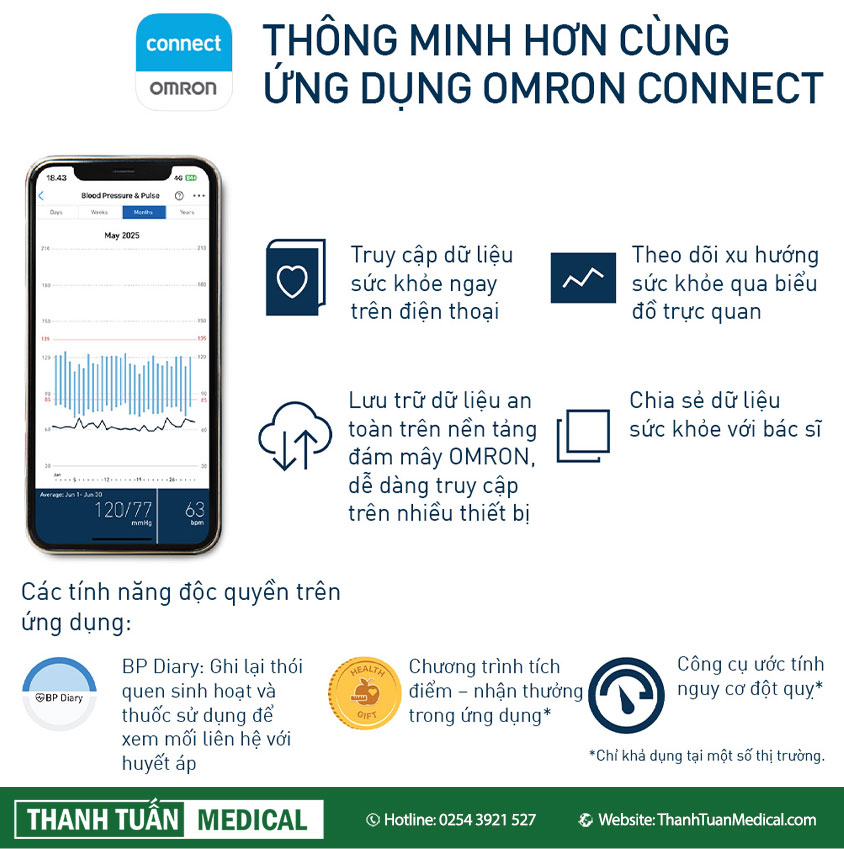 Vá»›i kết nối Bluetooth, các chỉ số Ä‘o cá»§a bạn sẽ tá»± động được chuyển đến ứng dụng OMRON Connect, cho phép bạn theo dõi huyết áp theo thá»i gian và chia sẻ dữ liệu vá»›i các chuyên gia chăm sóc sức khá»e hoặc thà nh viên gia đình.